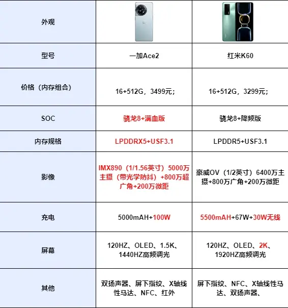 红米则是2K屏幕分辨率,还有30W的无线充,电池也是最大,不过在影像是要弱于一加Ace2,芯片上用的是降频版骁龙8+处理器。