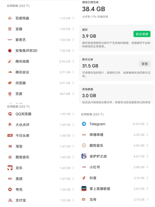 内存不足很容易迫使用户换机,特别是监管力度不大的安卓APP市场,这些APP内存越来越大,光一个“小而美“的微信就快占据40G的内存,其他日常APP也不遑多让,顺便一个都是1G起步,有时同一个类型的APP还能下好几个,不同的APP功能还不一样。