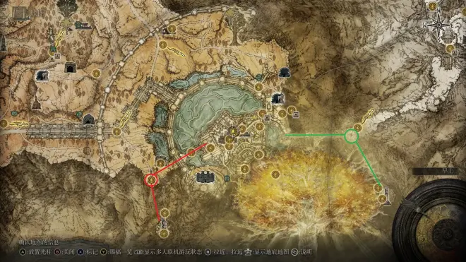 另外值得一提的是,城寨的极西还有一段神秘的断桥——神授桥。虽然我们可以通过这里的传送门去往玛莲妮亚大卢恩所在的孤立神授塔。然而,我们注意到,在这个断桥的附近确实存在另一个神授塔:西亚坛神授塔,拉卡德大卢恩的所在。而神授桥的延长线上,则是小黄金树教堂。如果我们参照东亚坛神授塔及附近神授塔的走向,可以类似地也画出相对称的格局: