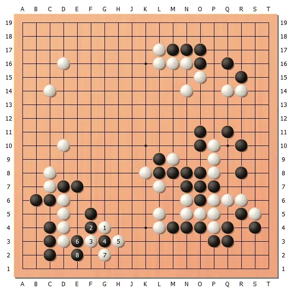 【图8】相较于第3局,芝野虎丸一点活棋机会都没有,这盘棋左上角的空间比较大,活动空间也很宽阔。在上方做眼对芝野虎丸来说一点难度也没有。