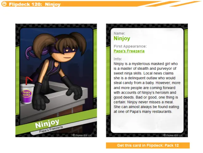 介绍:Ninjoy是一个神秘的蒙面女孩,她是潜行大师,也是甜蜜忍者技能的提供者。当地新闻称她是一名不法分子,会从婴儿那里偷糖果。然而,越来越多的人站出来讲述Ninjoy的英雄主义和善行。不管好坏,有一件事是肯定的:Ninjoy从不错过每一顿饭。你几乎总能看到她在老爹的众多餐馆里吃饭。