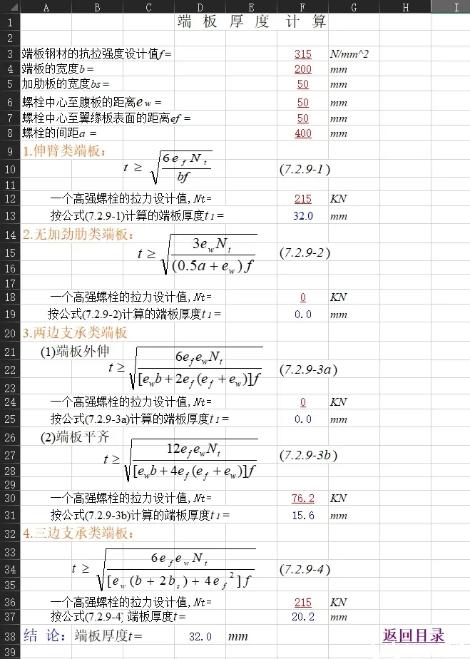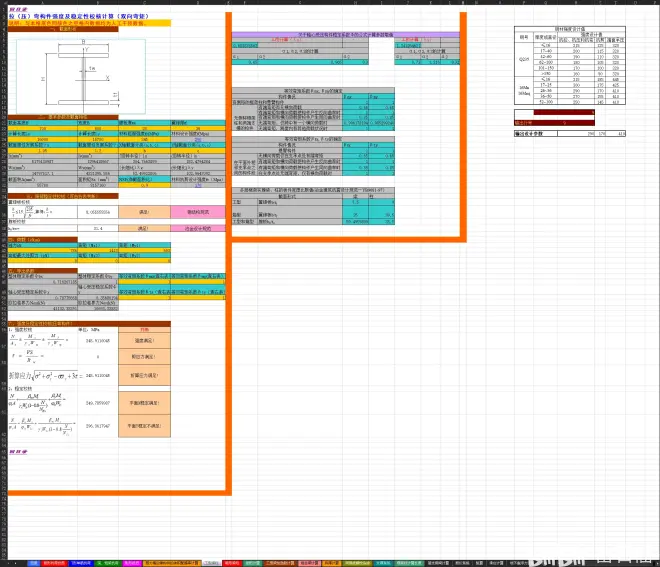 表格包含的内容:矩形截面单双筋-抗弯抗剪验算、单筋T形截面-抗弯验算、深梁与短梁-抗弯验算、矩形截面受弯剪扭-抗扭验算、剪力墙边缘构件的体积配箍率计算、框架梁板尺寸初定、框架柱尺寸初定、板配筋计算、荷载统计表、墙体荷载计算、楼面荷载计算、楼梯间荷载计算、剪力墙墙肢稳定计算、牛腿设计、受弯构件斜截面承载力计算表、水池侧壁及底板配筋计算、柱体积配箍率计算、雨蓬板配筋裂缝计算、雨蓬梁配筋裂缝计算、地下室外墙计算、墙高厚比验算、螺旋楼梯计算、板式楼梯计算、三折楼梯计算、一字形剪力墙配箍计算、L形剪力墙配箍计算、无翼墙L形剪力墙配箍计算、次梁附加钢筋计算、梁裂缝宽度、梁挠度计算、大偏心柱计算、抗压-偏压-混凝土柱计算、抗压-轴压-钢管混凝土柱计算、螺旋箍筋柱承载力计算、轴压混凝土柱承载力计算、支撑系统-ST梁,墙面斜撑,风拉杆计算、工型拉(压)弯构件强度及稳定性校核计算、箱形拉(压)弯构件强度及稳定性校核计算、工字型、T型、箱型截面斜撑计算、框架柱计算长度(有侧移及无侧移)、砼-钢组合梁计算、钢梁(工字型、箱型)受扭计算、工型梁加劲肋计算、简支钢梁计算、高强度螺栓连接计算、端板厚度计算系统、端板连接节点计算、吊车反力/牛腿受力 计算、吊车梁整体稳定性计算、柱脚计算、报价系统、承台计算、地下室浮力计算、垫层计算、独立基础、筏基底板冲切计算、钢筋混凝土柱基础设计、灌注桩及大直径桩竖向承载力设计值、基础沉降计算、基础计算程序、人工挖孔桩承载力计算、软弱下卧层验算、条形基础、主动土压力计算(库仑、朗肯理论)、桩基设计计算、条基地基梁、双柱设基础梁之基础计算、水泥搅拌桩计算、砌体结构梁端局部受压计算、材料参数、每米板宽内钢筋截面面积表、纵筋单排最大根数(2010新规范)、钢筋计算截面面积及公称质量表、配箍率(双肢箍、三肢箍、四肢箍)、框架梁受拉钢筋最小配筋率、梁截面配筋率、梁柱受力钢筋最小配筋率、双吊钩桥式起重机参数资料、LH型电动葫芦起重机参数资料、不锈钢天沟落水管、彩板天沟落水管、预应力计算。