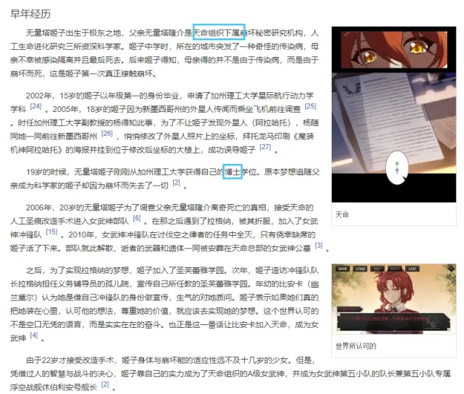 姬子:父亲有编制,感觉类似政治二代,自身有科研天分。父亲死亡后加入女武神部队调查真相(事实是其父自作自受),之后加入圣芙蕾雅学院做老师。以“最后一课”做结。