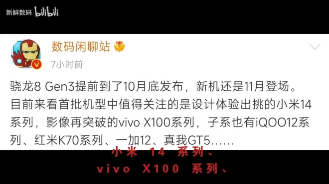据数码博主,数码闲聊站 爆料,骁龙8Gen3首批量产机,将于11月推出,首发机型包含,小米 14 系列、vivo X100 系列、iQOO12系列、Redmi K70 系列、一加 12、真我 GT5 期待一下。