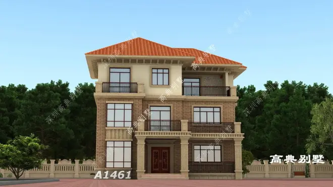 屋顶为橙色瓷砖。凸出的屋檐和阳台不仅增加了使用空间,而且使房屋凸凹不平。它看起来大气舒适,有品位又有品位,没有花哨的设计,美观、经济、实用。