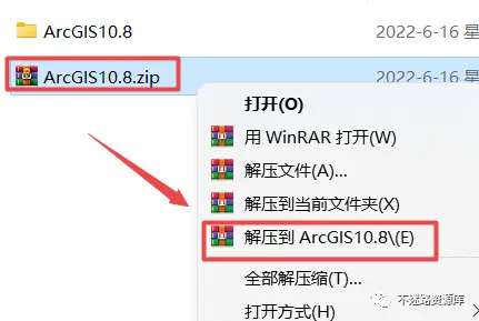 1.选中下载的压缩包,然后鼠标右键选择解压到"ArcGIS 10.8"(没有解压选项点这里)
