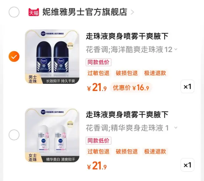 【16.9】妮维雅走珠2瓶腋下膏体滚珠香体露干爽抑汗清新留香