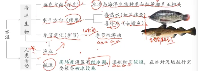 ①时间分布:同一海区,夏季海水温度高于冬季(季节分布)★ 季节的影响因素为太阳辐射