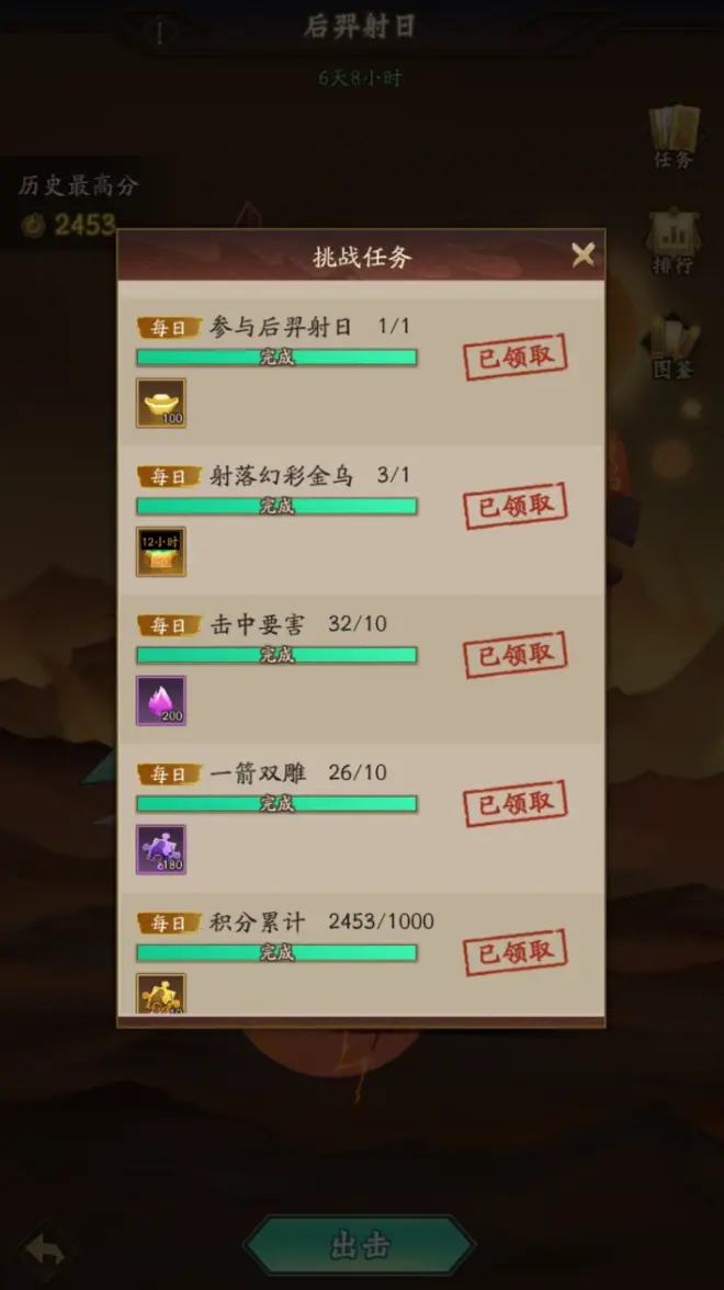 道友主线章节达到4章1回,同时服务器开服时长满14天后解锁。 活动期间,道友可通过后裔射日小游戏,完成每日挑战任务,领取元宝、紫气、紫色伙伴碎片、金色伙伴碎片、资源小时包等奖励。