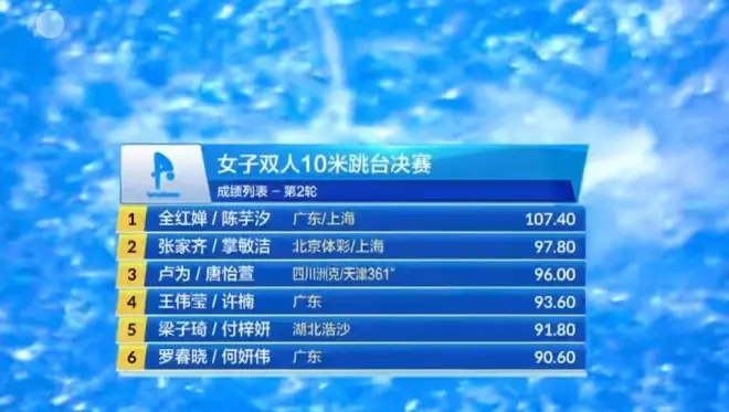 回到本次比赛中,在前轮规定动作过后,全红婵/陈芋汐二人的表现相当稳定,以107.4分暂列第一,而张家齐/掌敏洁以97.8分暂列第二位,距离第一名有着近10分的差距,不过第三名的成绩为96.00分,仅落后了张家齐/掌敏杰1.80分,后面三个动作的比拼还是很激烈的。