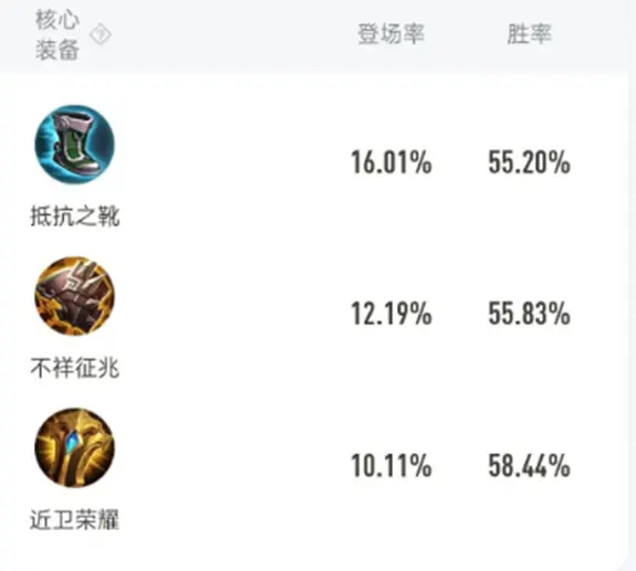 张飞的核心装备是抵抗之靴和不祥征兆以及近卫荣耀,有了近卫荣耀的加持,能更好的为队友提供防御属性,抵抗之靴防提高韧性,防止被控制时间过长。不祥征兆一定程度提高自身生命值,也一定程度对敌方射手攻速的制裁。