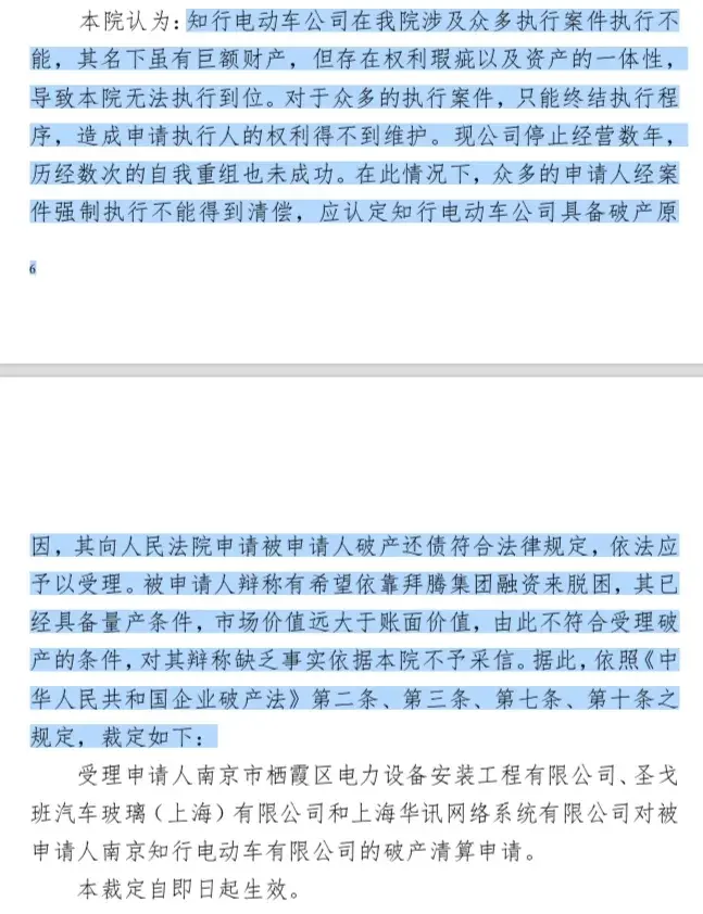 受理本次两起案件的南京市栖霞区人民法院表示,自2020年至今立案受理和待受理被执行人为知行新能源公司的执行案件80余件,涉案金额约1.5亿元;而知行电动车公司则涉及100余件,涉案金额约30.5亿元。上述法院表示,2021年期间,曾有债权人申请两公司破产还债,考虑到给其自我救助的机会,该院驳回债权人的申请。之后,两公司经历数次自我重组,但均未能摆脱困境,众多债权人权益仍不能得到维护。尽管本次两公司辩称有希望救活拜腾汽车,但法院在各种因素权衡下作出了支持立案的决定。