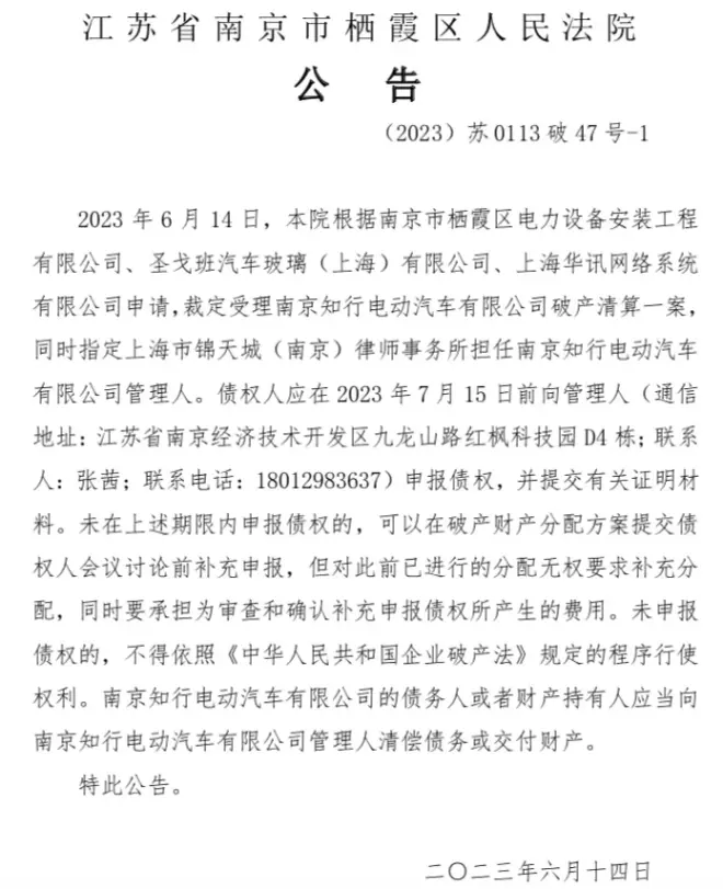 目前江苏省南京市栖霞区人民法院已裁定受理南京知行新能源汽车技术开发有限公司和南京知行电动汽车有限公司两家公司破产清算一案。