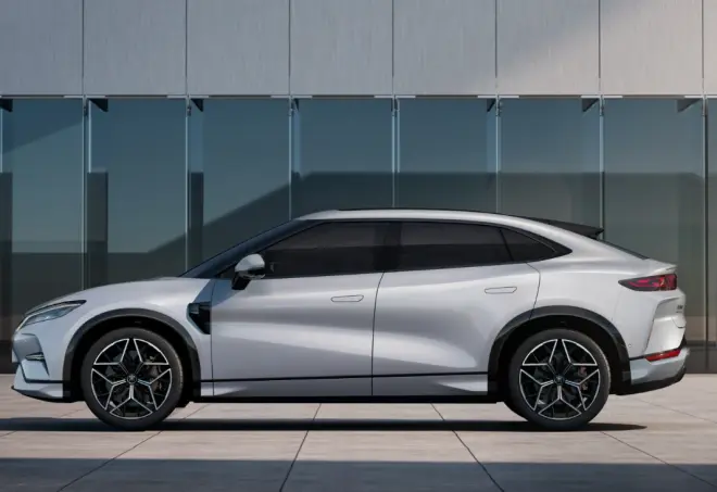 对于跨界SUV,喵哥觉得最好看的设计是车身侧面,首先宋L有着低趴的车身造型,然后还有溜背的设计,展现出优雅的车身姿态。另外,五角星式轮圈、隐藏式门把手、悬浮式A柱等设计元素也是足够时尚和潮流,同时还有一个设计值得注意,这车的溜背设计从C柱开始,这能有效保证后排乘客的头部空间。