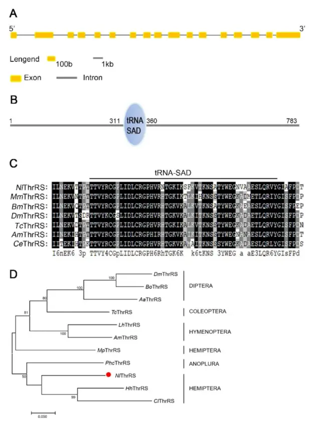 结论:本研究结果揭示了除蛋白质合成外,ThrRS在褐飞虱中的生物学功能,加深了我们对昆虫tRNA合酶的理解,并为通过一种dsRNA设计防治几种水稻害虫提供了新思路。