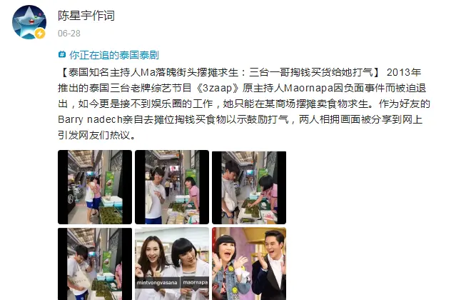 【泰国知名主持人Ma落魄街头摆摊求生:三台一哥掏钱买货给她打气】 2013年推出的泰国三台老牌综艺节目《3zaap》原主持人Maornapa因负面事件而被迫退出,如今更是接不到娱乐圈的工作,她只能在某商场摆摊卖食物求生。作为好友的Barry nadech亲自去摊位掏钱买食物以示鼓励打气,两人相拥画面被分享到网上引发网友们热议。