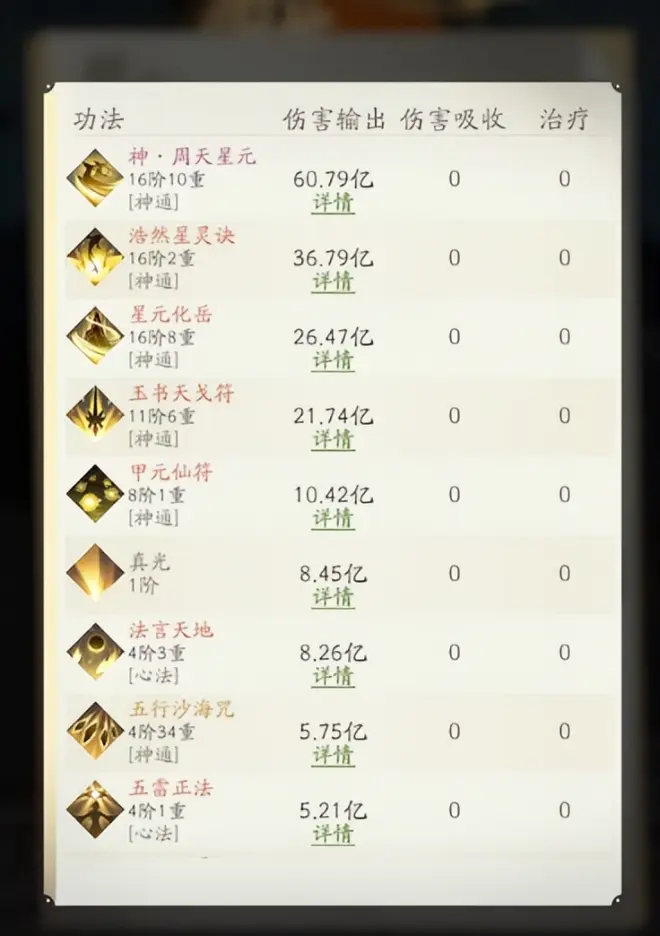 这里按照16阶给各位道友来举例一下,浩然、玉书符、甲元、元磁的伤害(周天和星岳自带buff,所以必要保留):
