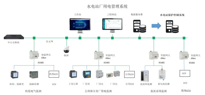 Acrel-3000水电站厂用电管理系统针对水电站内水轮发电机组、升压变压器、出线回路、厂用变压器及厂用电低压部分、直流系统直流屏及蓄电池、现地控制单元(LCU)等部分的电气和非电量参数进行集中监测,还可以接入站内保护测控单元,实现电站的发、用电监控、设备管理和运维管理。