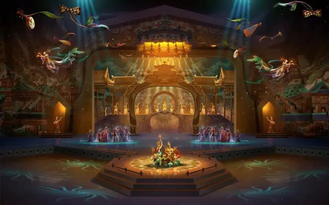 作品溯源敦煌文化,借助对莫高窟壁画、古籍的深度解读梳理,活化敦煌古乐器、古乐谱研发成果,用先进的全息投影、3D威亚等高科技手段,以全沉浸式的呈现方式,演绎了西域少年白氏追寻艺术的动人故事。