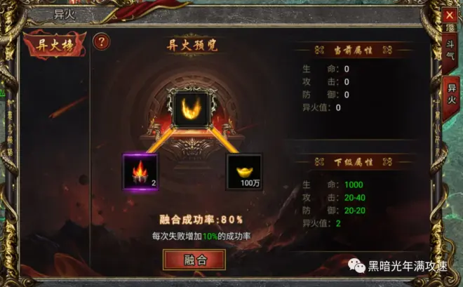 大家好,欢迎来到【黑暗光年满攻速】,在昨天的更新中黑暗光年新增了异火系统,很多朋友还不了解异火系统如何开启?异火如何升级?今天小编就来给大家介绍一下吧!黑暗光年游戏下载、折扣福利尽在【黑暗光年满攻速】公众号哟!