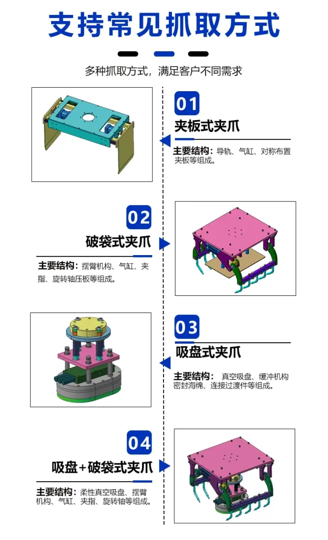 • 特制吸盘、破袋等常用抓手,可轻松应对不同抓取方式;