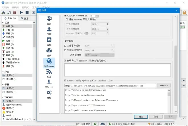 4、可以自动更新订阅公共Tracker服务器地址列表(该选项默认关闭)