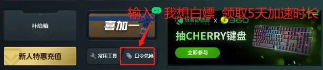 没有加速时长的话可以在下方的口令兑换中输入【我想白嫖】就可以领取5天的加速时长。