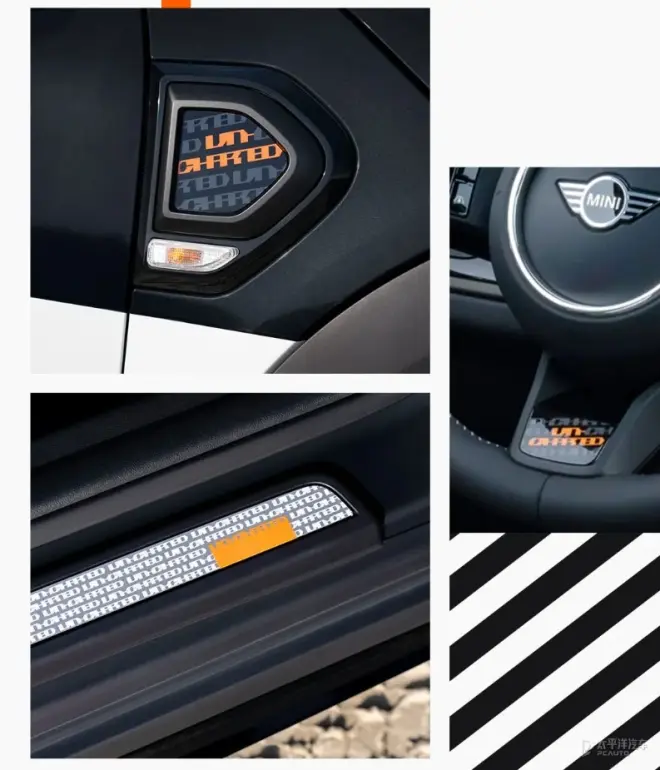 该特别版车型最引人注目的地方就是它独特的外观设计。MINI COUNTRYMAN Uncharted Edition采用了白蓝橙三色涂装,黑色品牌标识、行李架以及多辐式轮圈等元素,使得整车看起来更加时尚个性化。此外,在侧面通风孔上还印有“Uncharted”字样的标识,彰显出该车与众不同的身份。