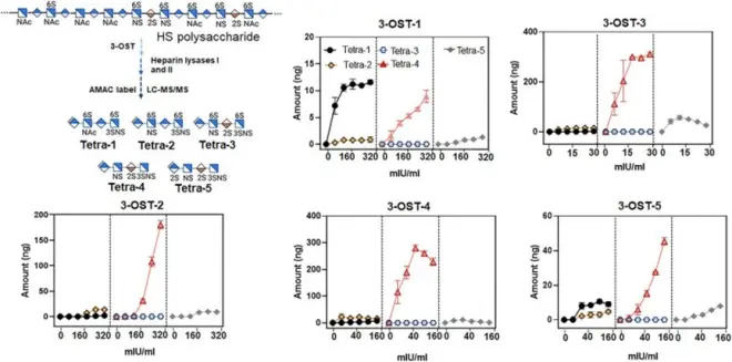 在体外条件下使用不同的3-OST同工酶对HS进行修饰,研究人员分析了3-O-硫酸化四糖的水平。通过LC-MS/MS分析,研究人员确定了不同同工酶产生的3-O-硫酸化结构域的数量。结果显示:3-OST-1是产生Tetra-1的主要同工酶,而其他同工酶主要生成Tetra-4。此外,研究人员还观察到不同同工酶对其他3-O-硫酸化结构域的生成也存在差异。