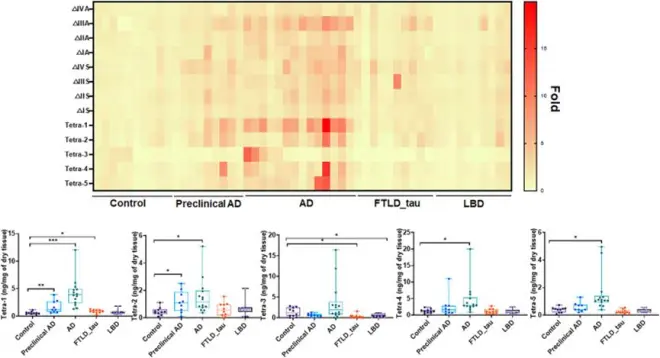 通过上述方法,研究人员对不同神经退行性疾病组和健康组的脑组织进行了3-O-硫酸化HS水平的分析,发现特定的3-O-硫酸化四糖标记物在疾病组与对照组之间存在数量变化,特别是在AD组中Tetra-1的数量显著增加。这揭示了与神经退行性疾病相关的3-O-硫酸化HS的变化,为进一步研究疾病机制和潜在治疗靶点提供了重要线索。