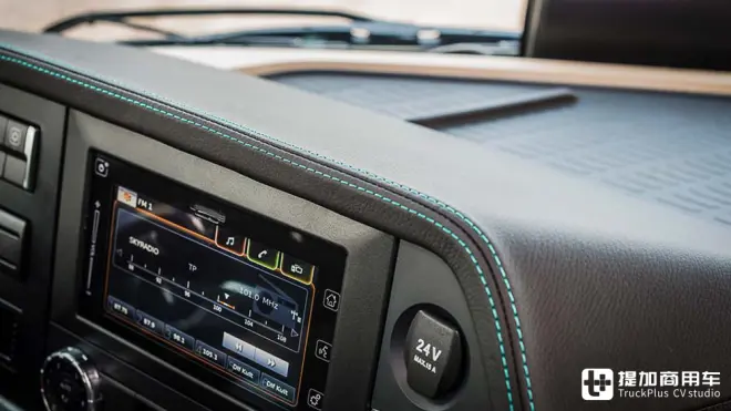 杯架处带有Actros 1的特殊铭牌。这款卡车仅在英国销售,限量100台,很快就被订购而空。