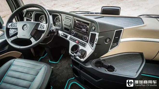 内饰部分虽然是奔驰Actros MP4的标准布局,但奔驰卡车英国公司引入了一套叫“StyleLine”的设计风格。这套内饰包括皮质方向盘、皮革按摩座椅、自动空调、微波炉、冰箱、电动天窗和电动遮阳帘等配置,为驾驶员营造更浓的生活气息。