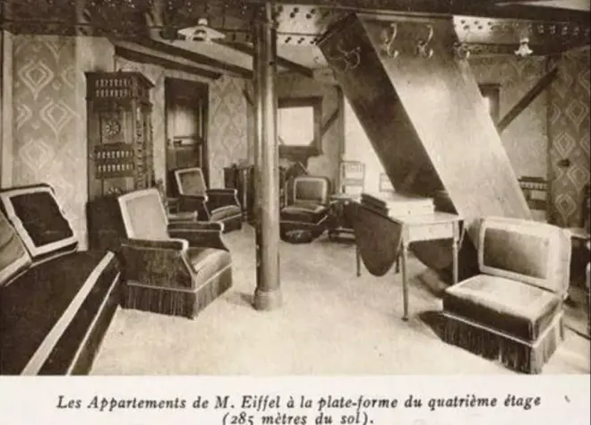 公寓外面有一个角落阳台,配备了台望远镜,可以让埃菲尔观察整个巴黎市。真正的公寓最初只有两个房间,不向公众开放,因为当时埃菲尔拒绝了任何在公寓里过夜的要求——当然,他受邀的客人除外。