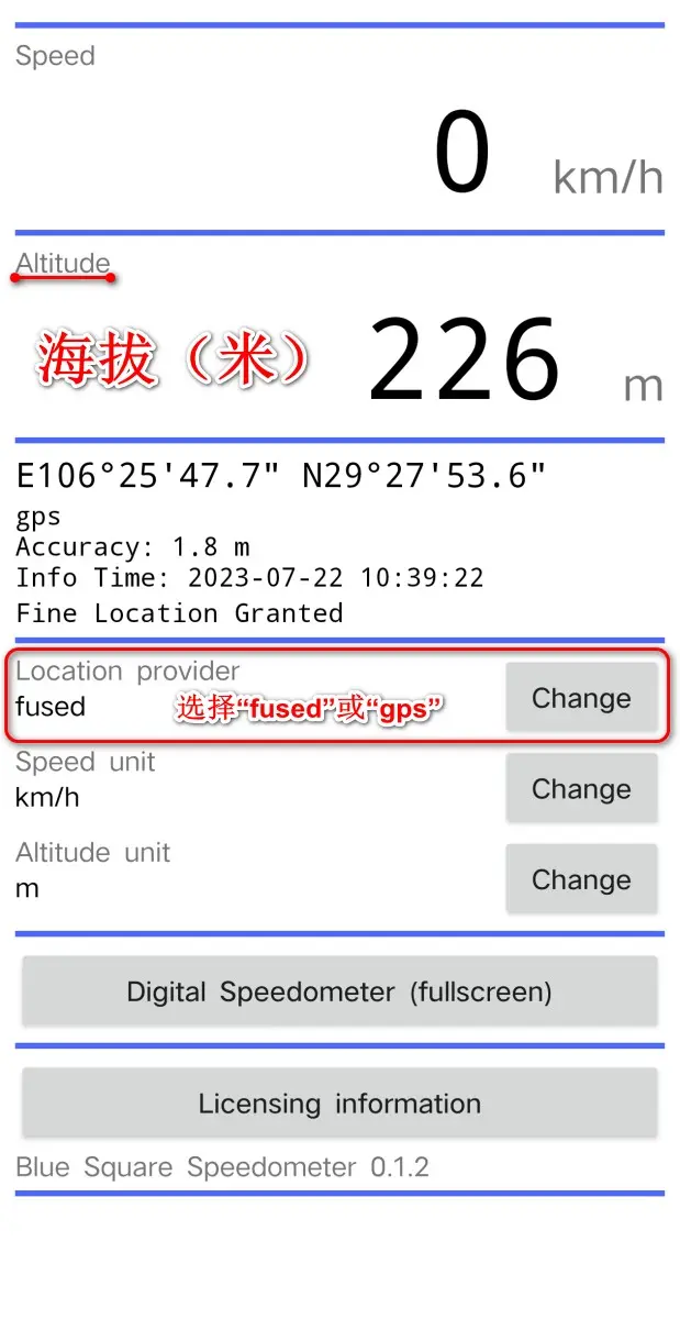 安卓查看经纬度海拔位置信息的工具:Blue Square Speedometer