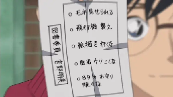 原来,柯南已经解开了明美留下的暗号,并找到了时间胶囊。只要直视明美的暗号,就能发现“图书委员宫野明美”这几个字的摆放位置有所不同。如果说横向的字代表曾经坐在电脑面前的图书委员,那另一边垂直排列的暗号就是键盘上的文字了。【去看莫奈】用键盘输入的图案是し;【袭击飞机】则是い;【不要去画画】是く;【医生不能说谎】是こ;最后的【不能烧掉的89护身符】是や,连起来就是:しいくこや(饲养小屋)