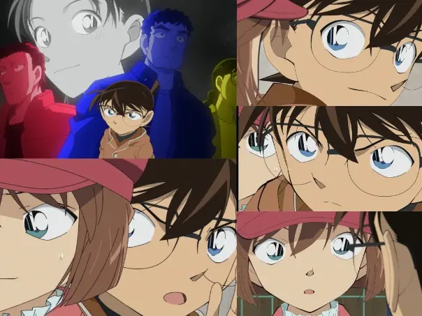 前篇作画监督是河村明夫,这位老作监在本次漫改发挥只能算是差强人意。虽然经过修正后有不少特写的质量得到了保证(如下图左二的柯南影指定较为精致),但仍然有部分特写以及中远景出现了崩坏,尤其是图二右下角的若狭崩坏较为严重(这里要吐槽一下若狭出场的系列大多都出现了崩坏,如野菜篇及牧场篇)。