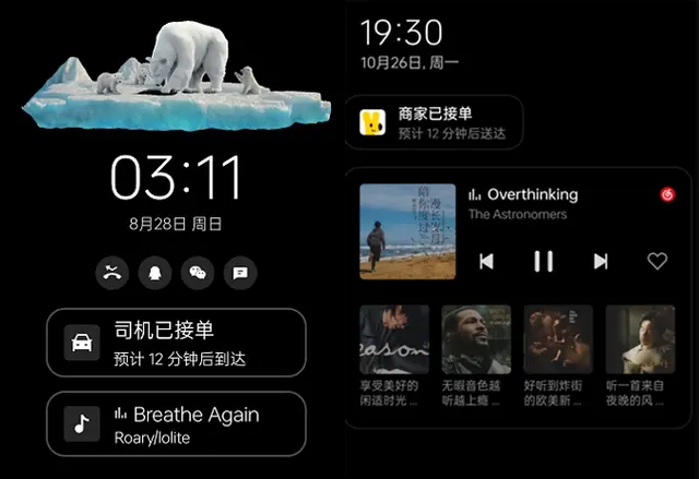除此之外,新系统还新增了诸如大文件夹、智慧息屏等功能,可以让手机在不同场景下的使用变得更高效。就拿智慧息屏来说,该功能可以在锁屏界面直接呈现外卖、加车、听歌等实时状态,让你平时无需再解锁手机点开APP进行操作,在锁屏界面即可完成相关体验,非常的高效方便,值得肯定。