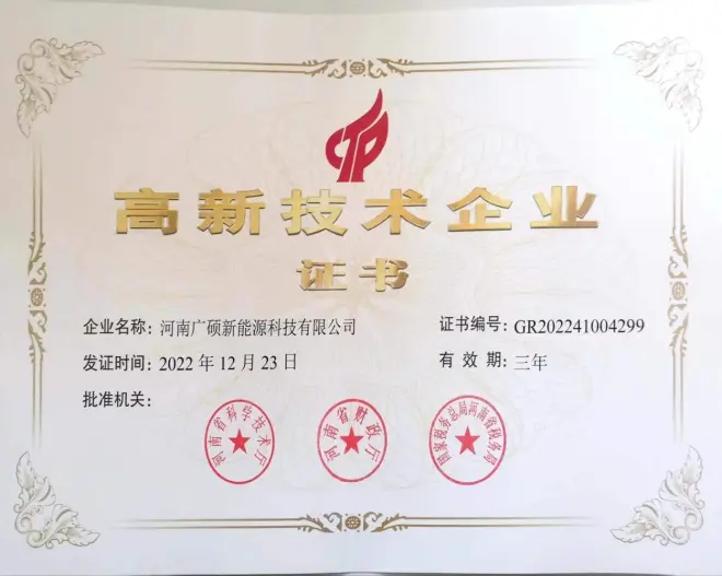 近日,河南省认定机构2022年认定的第一批高新技术企业备案名单出炉。河南广硕商业管理集团有限公司——河南广硕新能源科技有限公司获评河南省高新技术企业,公司打造了河南第一家餐厨垃圾生物质发电企业,目前自主申请和获得授权的专利共计17项,申请软著21项