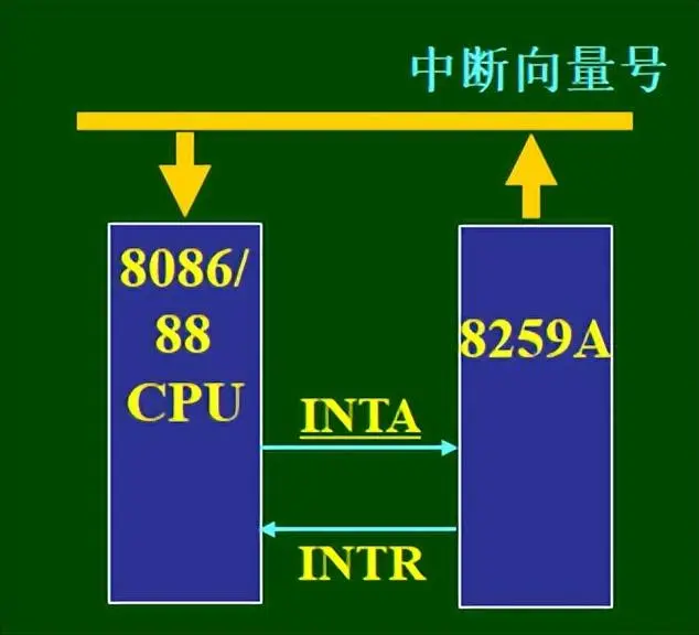 从上图看到,因为8259是用于中断信号处理的,因此这块芯片和CPU之间最主要的连接就应该是中断请求和中断响应,图中通过引脚INTA和INTR实现,两者都是通过电平信号实现的,比如INTA发出一个5伏特的电压表示中断请求,INTR则以一个0伏特的电压表示响应。
