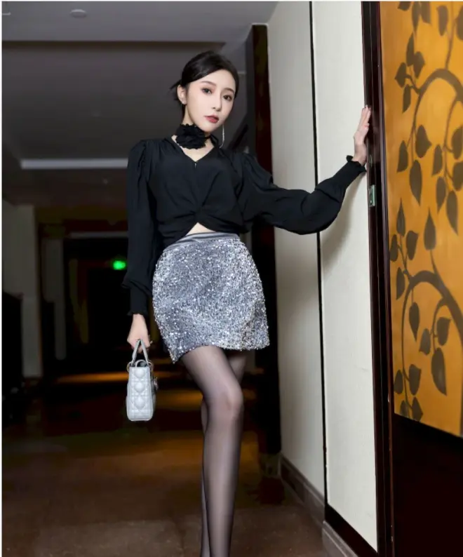 秀人网性感女神王馨瑶yanni黑丝上衣搭配银灰色短裙写真
