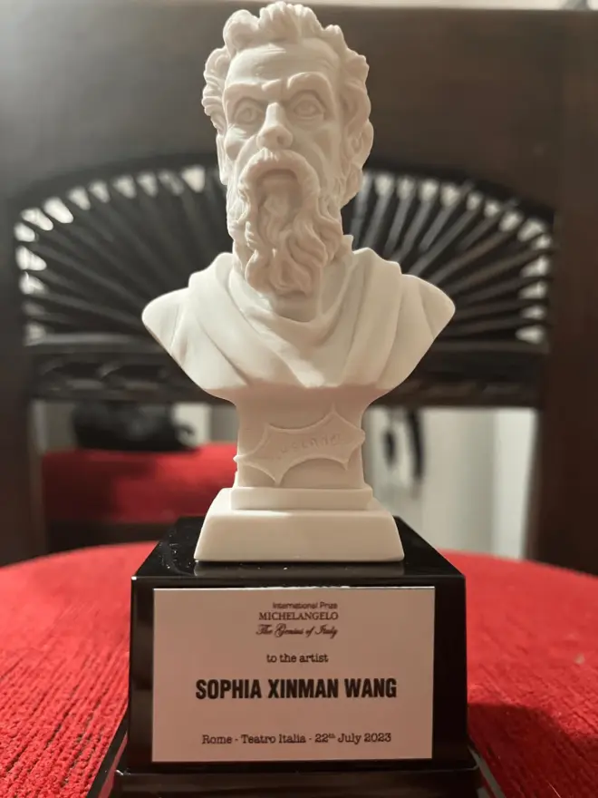2023年中国生态环保艺术家王馨曼荣获“米开朗基罗国际奖 - 意大利的天才”奖杯。