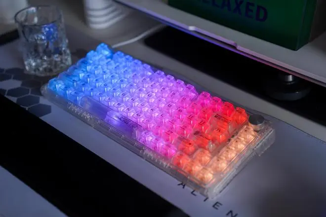 机械师 K500F具有晶莹外观,共有白晶、绿晶、蓝晶、黑晶四种颜色可选。我觉得最吸引人的地方就是透明的外观设计:采用PC晶透球帽,触感舒适,字符清晰耐磨,不易产生油腻感,让敲击更顺手,并且还避免了全套键帽在开灯效使用时产生的灯光晃眼问题,结合ABS透明机身,通体晶透,灯光透过冰晶轴体,从里到外灵动散射,营造氛围感拉满的电竞环境。