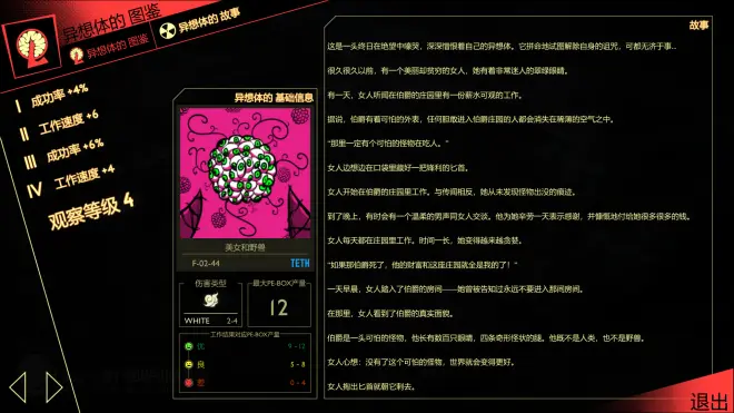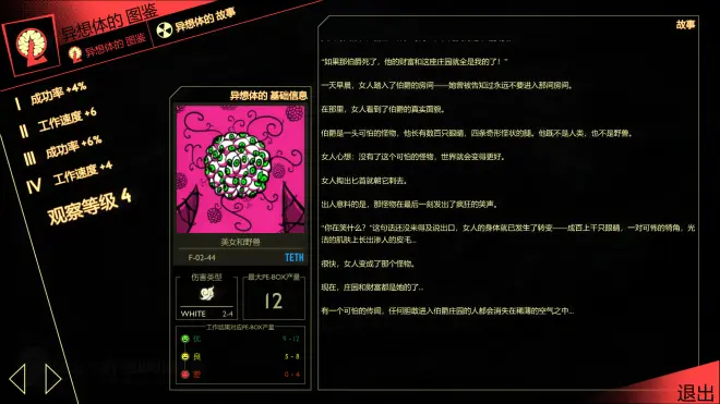 1、对“美女和野兽”进行压迫工作时有着非常高的成功率。压迫工作能显著提高这个异想体的PE-BOX产量,但会恶化其健康状况