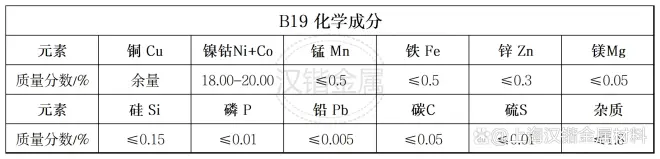 B19白铜为结构铜镍合金。铜镍合金具有良好的导电性、导热性和良好的机械性能,其冷热压力加工性能也非常好。同时具有色泽美观、耐腐蚀性强等优点,在工业生产中得到广泛应用。随着科学技术的发展,金属合金被广泛用于制造各种机械工具,而白铜由于其优良的物理性能和化学性质应用于船舶业、仪器仪表、医疗器械、工艺装饰品等领域,其优良的性能经过工程实践检验,可靠稳定,也是重要的电阻和热电偶合金