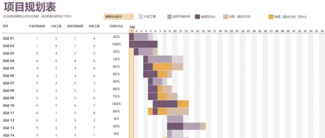 比如微软官方提供的模板:优点是好看,左边是数据,右边是甘特图。但是由于是项目规划表,所以看着比较复杂,一些功能点可能用不到,需要自己删一删。
