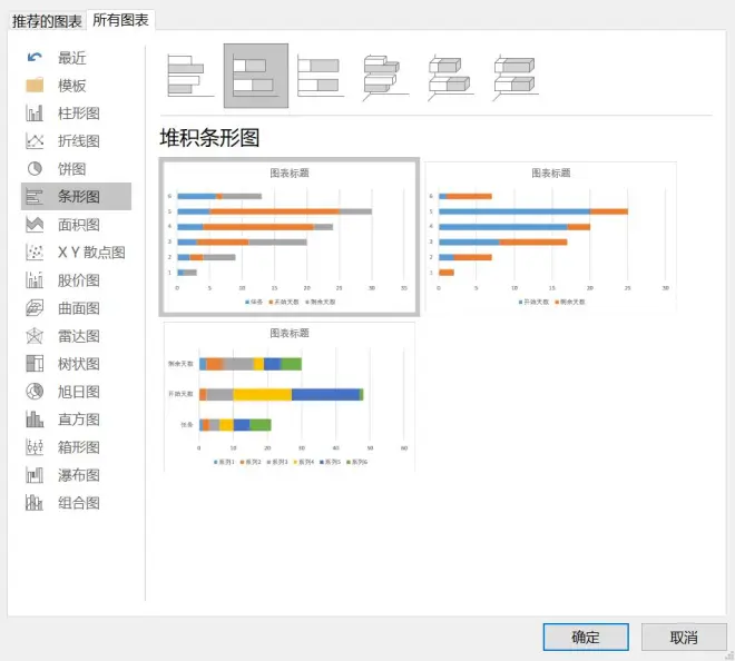 2、选择工具栏:“插入”>“条形图”>“堆积条形图”: