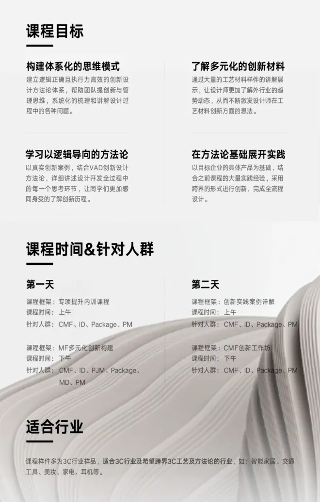 希望借此能更多元化的了解3C行业的工艺材料,创新逻辑、思维洞察、设计落地等信息及方法论,并在此基础上带着大家一起进行案例的分析与讨论,最后结合企业指定的某一款产品进行设计共创,从而带领和启发大家一起进行方案发散与设计创意。
