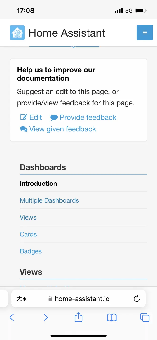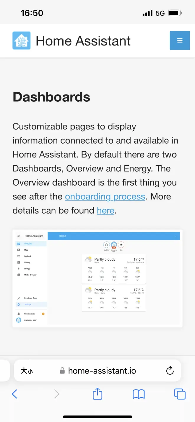 后面的几个我以后再介绍,感兴趣的可以去官网自己看。网址https://www.home-assistant.io/getting-started/concepts-terminology/。 今天着重讲一下这个,也是我认为在ha里最重要的一个。 dashboard:家庭助理仪表板是用户使用手机和台式机管理家庭的一种快速、可定制和强大的方式。 我们按照官网中的提示分几个步骤介绍。