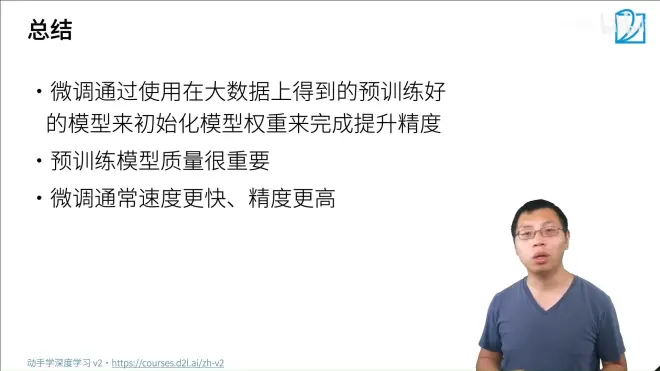 的参数被初始化为源模型相应层的模型参数。 由于模型参数是在ImageNet数据集上预训练的,并且足够好,因此通常只需要较小的学习率即可微调这些参数。