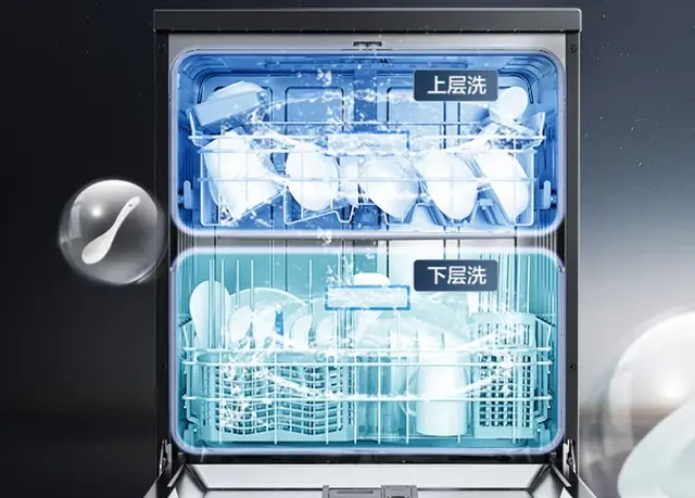 它的上层和下层可以分开洗,平常如果是碗筷比较少的话,单层洗就可以了,就可以智慧节能,洗完碗筷之后,通过双驱热烘,可以有效抑菌消毒,这一款手机还可以通过手机远程操控。